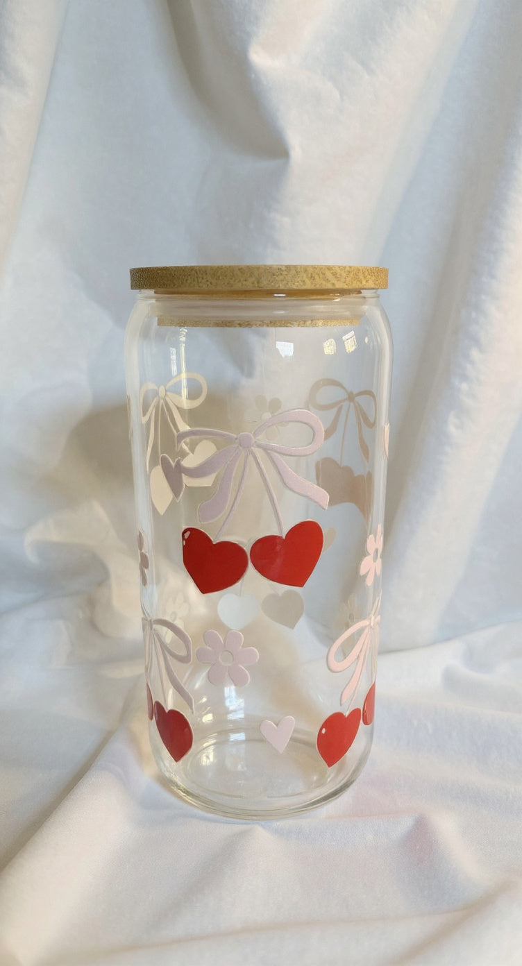 Red Cherry Bows 16oz Glass Tumbler with Lid, Straw & Cleaner